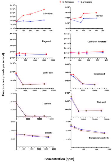 Release of potassium ions was determined using a potassium-binding benzofuran isophthalate probe (PBFI; Invitrogen, Carlsbad, CA, USA) as described previously []. Briefly, DACS of Salmonella Tennessee and Livingstone were centrifuged and the cell pellets were resuspended in 5 mM HEPES buffer (Sigma Aldrich) supplemented with 5 mM glucose (Fisher Scientific). Aliquots (90 µL) of the resuspended cells were added to wells of a black, nonbinding-surface, 96-well microplate (Corning, Tewksbury, MA, USA). The potassium probe was dispensed to each well at a final concentration of 2 µM before the addition of 10 µL of the food additives, which were prepared as described in a previous section. The food additives were applied at different concentrations (Figure 1) that ranged from sublethal to lethal levels that were reported in previous studies [,,,,,,] except carvacrol and thymol, which were applied based on their MIC levels determined in the current study. Polymyxin at 10 ppm was used as a positive control. Fluorescence, corresponding to potassium ions concentration, was measured using a microplate reader (Perkin-Elmer, Wellesley, MA, USA) at excitation and emission wavelength of 346 or 505 nm, respectively. Fluorescence measurements were normalized by removing the background fluorescence noise.