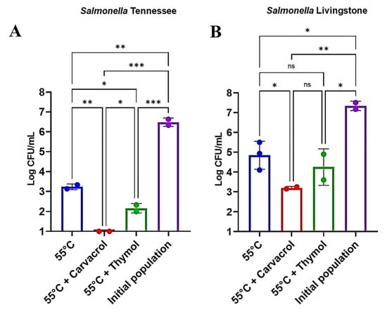 Changes in populations of desiccation-adapted Salmonella Tennessee (A) and Livingstone (B) in response to heat treatment and pretreatment with carvacrol and thymol. Values are averages of three replicates ± standard deviation. Asterisks denote significant differences between averages (* p < 0.05, ** p < 0.01, *** p < 0.001), “ns” = not significantly different.