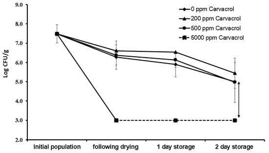 Freeze-drying is a dehydration process that is used for preservation of many foods such as fruits, seafood, coffee, and others []. In the current study, carvacrol at different concentrations (200, 500, and 5000 ppm) was added into liquid milk to sensitize Salmonella Typhimurium ASD200 to the dehydration stress mediated by freeze-drying. Compared to the carvacrol-free freeze-dried milk, samples with carvacrol at 5000 ppm decreased Salmonella Typhimurium population below the detection limit of the enumeration method, which was 3 log CFU/g milk (Figure 3). This population reduction was observed immediately following freeze-drying and during the 2-day storage of the dried milk at 22–25 °C. In contrast, treatment with carvacrol at 200 or 500 ppm did not significantly (p > 0.05) reduce Salmonella levels in the freeze-dried product, compared to the carvacrol-free control (Figure 3).