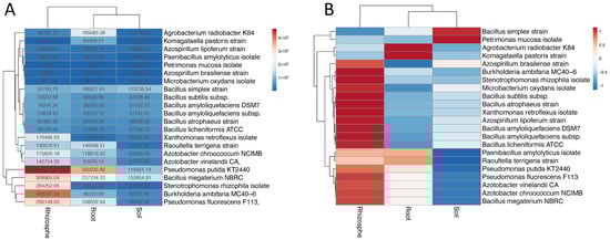 Heatmaps of fragment recruitment counts on 22 plant growth promoting (PGP) microbial genomes in three different environments (Rhizosphere, Root, and Soil according to descriptions provided in the metadata of the analyzed datasets). (A) The heatmap was plotted using normalized fragment recruitment counts (normalized to the total number of sequence reads of each environment). Both, rows and columns, are clustered using the Euclidean distance and average linkage method. (B) Rows of the heatmap are scaled using unit variance scaling (Autoscaling). Both, rows and columns, are clustered using the Euclidean distance and average linkage method. Please note that the different order of species designations between panels A and B is due to the applied cluster algorithm.