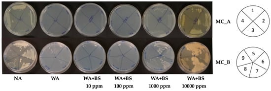 Bacterial strains belonging to microbial consortia (MC)_A (on the top) and MC_B (on the bottom) growing in starvation conditions in the presence or absence of BS2 ranging from 10 ppm to 10,000 ppm. Tested strains for MC_A: B. licheniformis PS141 (1), A. chroococcum LS132 (2), K. pastoris PP59 (3), P. granadensis A23/T3c (4), MC_B: B. amyloliquefaciens LMG 9814 (5), P. fluorescens DR54 (6), Bacillus sp. BV84 (7), R. aquatilis BB23/T4d (8), and A. vinelandii DSM 2289 (9). For a better view of the position of each strain, a plating scheme was added to the right. The plates on the right report the numbers corresponding to each of the tested strains in MC_A (1–4) and MC_B (5–9). The bio-assay was performed in triplicate. NA = Nutrient agar; WA = water agar; BS = Biostimulant.