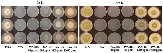T. harzianum TH01 growing in starvation conditions in the presence or absence of BS2 ranging from 10 ppm to 10,000 ppm. On the left, the effects of BS2 at 48 h, on the right the effects at 72 h. The bio-assay was performed in triplicate. PDA = Potato Dextrose Agar; WA = water agar; BS = Biostimulant.