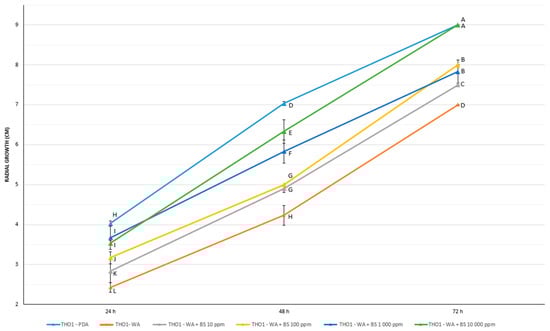 Prebiotic effect of BS2 on T. harzianum TH01 growth in starvation conditions. WA = water agar; PDA = Potato Dextrose Agar; BS2 = Bioactive compounds BS2. A two-way repeated ANOVA with Student-Newman-Keuls (SNK) test was performed for data analysis. Different capital letters (A–L) indicate significant differences between treatments (p < 0.05).