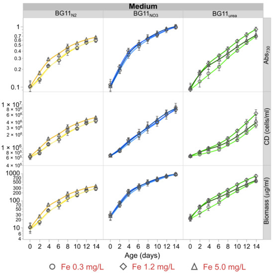 Figure 1 summarizes the 14-days evolution of Abs730, cell density and biomass concentration for Anabaena cultured in BG11N2, BG11NO3, and BG11urea media with different starting Fe levels. The results of fitting growth data to a saturation kinetic model are presented in Figure S3.