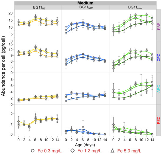 Increasing Fe availability resulted in consistent reduction of the average cellular abundance of CPC and APC in Anabaena cultures. Higher Fe levels reduced the average cellular abundance levels of CPC and APC in BG11NO3, at least during the early stages of growth (Figure 2, up to day 10). These results agree with semi-quantitative reverse transcription-polymerase chain reaction (PCR) data suggesting downregulation of tetrapyrrole and phycocyanobilin biosynthesis (i.e., the PCB chromophore) in wild-type Anabaena at low levels of FurA redox-sensing transcription factor in Fe replete conditions. Under low Fe availability conditions, high FurA levels increase the transcript abundance of Heme oxygenases I and II (EC 1.14.99.3), promoting the synthesis of PCB, which is the blue pigment of CPC and APC proteins [12]. As cells reproduced over time, Fe became scarcer on a per-cell basis, leading to upregulation of PCB production at later stages of cell growth. In BG11N2 cultures, CPC abundance was also higher at lower Fe-levels, but PEC and APC abundance values were not affected by changing Fe levels. In BG11urea, low Fe levels (initial Fe 0.3 mg/L) also amplified the production of PCB, which is the only chromophore in CPC and APC. Low Fe availability generated a remarkable increase of APC accumulation in BG11urea. These results also agree with RNA-Seq experiments presenting transcription levels of genes encoding the subunits α and β of APC (alr0021 and alr0022) in Anabaena. Transcript abundance of these genes in medium with NH4+, a product of intracellular and extracellular degradation of urea, was two times the transcription level in diazotrophic cells [74,75,76].