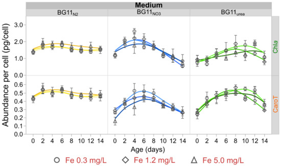 Chla and CaroT concentration profiles constructed with cold acetone extraction data are presented in Figure S7. After considering the cell density, relative cellular abundance data for Chla and CaroT are summarized in Figure 3. Cultures in BG11NO3 and BG11urea media exhibited similar profiles, with maximum values of Chla and CaroT abundance in the exponential phase (between 4 and 8 days). In contrast, cellular abundances of Chla and CaroT in diazotrophic cells (BG11N2) were almost constant. The production rate of Chla and CaroT in BG11N2 was also constant (Figure S7). Although low Fe-levels (0.3 mg/L) apparently promoted higher abundance of Chla and CaroT in BG11NO3 and BG11urea cultures, statistical analysis did not provide definitive evidence to justify a significant effect of Fe-availability on cellular abundance of these hydrophobic pigments (Figure 3 and Table S6). However, the N-source of the growth medium significantly affected the cellular abundance of Chla. Using the average values of Chla abundance on day 4 (Table S6), cultures in BG11urea accumulated around 50% less Chla than cells grown in BG11NO3 and BG11N2 media.