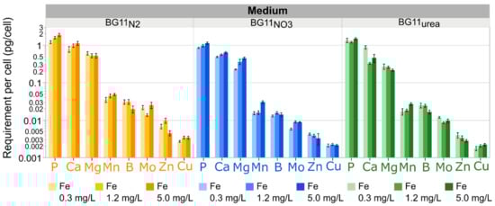 Ranking of mineral element demands per cell. Element demand are calculated based on the cellular production in the exponential phase. P, Ca and Mg are the most important inorganic nutrients, excluding C, Fe, and N-sources. These elements participate in ATP biosynthesis, cellular signaling and Chla production. Mn is essential for photosynthesis and oxidative stress defense. B and Mo are more important for diazotrophic cells in BG11N2. Zn and Cu are involved in gene regulation and electron transfer through PSI, respectively. Each bar represents estimated requirements using the derivatives of nutrient consumption expressions with respect to cellular density (Table S8). Error bars represent the confidence fit interval of estimated demands with a significance level α = 0.05. Actual sizes of the error bars may differ due to the logarithmic scale on the Y-axis. Data represent results for three biological replicates per medium type and Fe level combination.