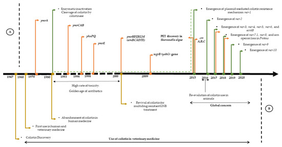 Timeline of the main events related to colistin, from the discovery of colistin to the development of resistance (A) represents the described mechanisms, the green arrows symbolize the enzymatic mechanisms, the orange arrows symbolize the chromosomal mechanisms. (B) represents the chronology of colistin.