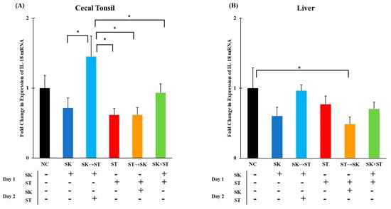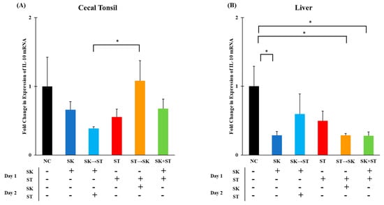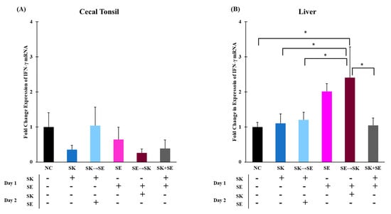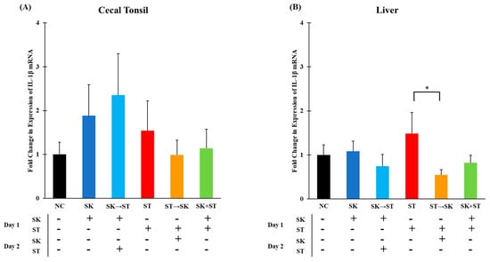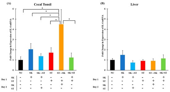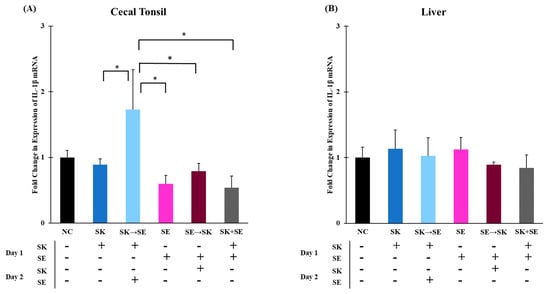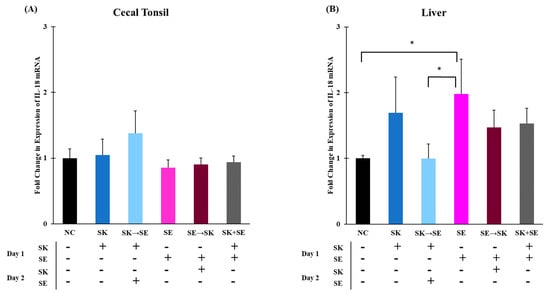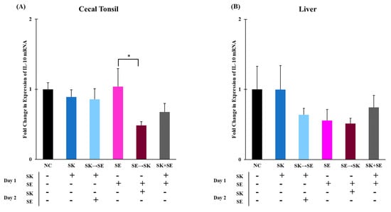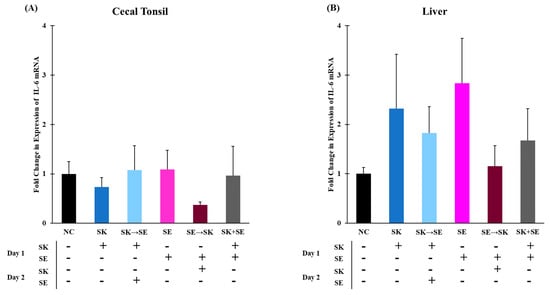 - Cheeseman, J.H.; Kaiser, M.G.; Ciraci, C.; Kaiser, P.; Lamont, S.J. Breed effect on early cytokine mRNA expression in spleen and cecum of chickens with and without Salmonella enteritidis infection. Dev. Comp. Immunol. 2007, 31, 52–60. [Google Scholar] [CrossRef] [PubMed]