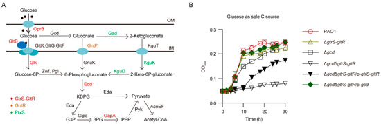 Proposal pathways of glucose metabolism and bacterial growth assays. (A) Schematic view of predicted glucose utilization and metabolism pathways in P. aeruginosa inferred from previous studies [23,51]. Proteins are shown in different colors according to the regulators (e.g., GtrS-GltR, GntR, and PtxS) that participate in their transcriptional regulation [25,26,52]. OM, outer membrane; IM, inner membrane; OprB, glucose porin; GltB, periplasmic glucose-binding protein [53,54,55]; GltK, ATP-binding component of ABC transporter; GltG and GltF, permease of ABC sugar transporter; GntP, gluconate permease; KguT, 2-ketogluconate (2-KG) transporter; Gcd, glucose dehydrogenase; Gad, gluconate dehydrogenase; Glk, glucokinase; GnuK, gluconokinase; KguK, 2-KG kinase; Zwf, glucose-6-phosphate 1-dehydrogenase; Pgl, 6-phosphogluconolactonase; KguD, 2-KG reductase; Edd, phosphogluconate dehydratase; Eda, 2-keto-3-deoxy gluconate aldolase; Glpd, glycerol-3-phosphate dehydrogenase; GapA, glyceraldehyde-3-phosphate dehydrogenase; Pyk, pyruvate kinase; AceEF, pyruvate dehydrogenase. KDPG, 2-keto-3-deoxy-6-phosphogluconate; G3P, glyceraldehyde-3P; 3PG, 3-phosphoglycerate; PEP, phosphoenolpyruvate. (B) The growth curve of P. aeruginosa strains cultured in 96-well plates containing minimal medium (MM) supplemented with 10 mM glucose as the sole carbon source. PAO1, ΔgtrS-gltR, Δgcd, and ΔgcdΔgtrS-gltR harbor an empty pAK1900 vector as control; p-gtrS-gltR denotes the pAK1900-gtrS-gltR plasmid; p-gcd denotes the pAK1900-gcd plasmid. OD600, an optical density at 600 nm. Data from n = 3 biological replicates reported as mean ± SD.