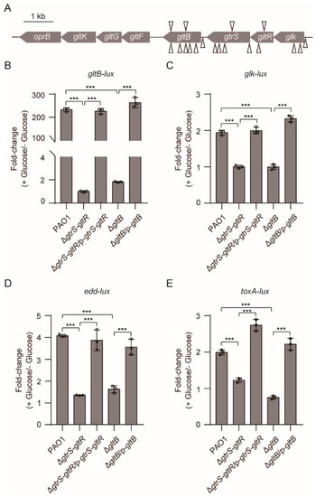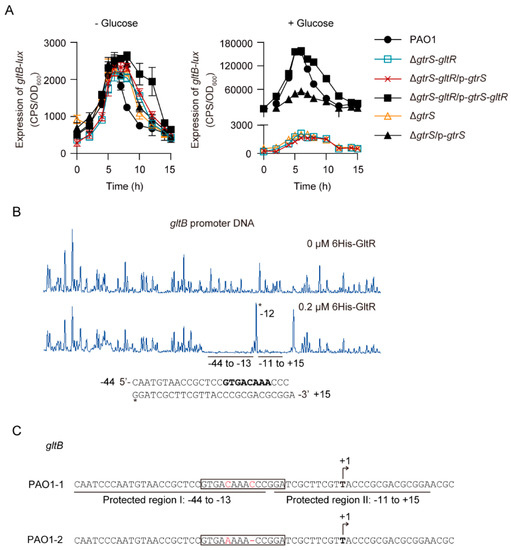 Genes encoding the P. aeruginosa glucose catabolism are organized in operons and are under the control of different regulators (i.e., HexR, PtxS, PtxR, GntR, and GtrS-GltR) [23]. Among them, response regulator (RR) GltR, which forms a two-component system with its cognate sensor kinase (SK) GtrS [26], is required for glucose transport activity in P. aeruginosa PAO1 [20,27], presumably by activating the transcription of gltBFGK (gtsABCD)-oprB operon that encodes OprB porin and the glucose transport system ABCGltBFGK [28]. However, these results were somehow contrast to the findings of Daddaoua et al. [26], where GltR is a transcriptional repressor that is released from its target operators of glucose metabolism genes upon phosphorylation.