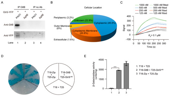 GltB can form a complex with GtrS. (A) Western blot image showing the co-Immunoprecipitation of GltB and GtrS-YFP. Whole cell extracts from WT PAO1 and ΔgltB mutant strains expressing gtrS-YFP were immunoprecipitated with (lanes 1, 2) or without (lanes 3, 4) anti-GltB antibody. (B) Categories of the putative GltB-binding proteins identified by co-Immunoprecipitation coupled with mass spectrometric (CoIP-MS). The identified proteins were classified into extracellular, outer membrane, periplasmic, cytoplasmic membrane, cytoplasmic, and unknown according to their potential cellular location (http://www.pseudomonas.com/ accessed on 1 May 2020). Percentage of proteins was indicated in the graph. (C) Surface plasmon resonance (SPR) analysis showing the interaction of 6His-GltB with 6His-GtrSLBD. Analysis performed in TraceDrawer using a 1:1 binding interaction model. KD, equilibrium dissociation constant. (D and E) Bacterial two-hybrid (BACTH) assays assessing the interaction of GltB and GtrSLBD. In (D), E. coli BTH101 recombinants bearing indicated combinations of plasmids were plated on selective media with maltose as the unique carbon source, and incubated at 30 °C for 6 days; in (E), the expression of β-galactosidase activity was examined in E. coli BTH101 recombinants bearing indicated combinations of plasmids cultured in LB broth containing 0.5 mM isopropyl-1-thio-β-d-galactopyranoside (IPTG) for 12 h, and data represented mean ± SD from n = 3 biological replicates (*** p < 0.001; Student’s two-tailed t-test). T18C/T25 (negative control plasmid), T18C-zip/T25-zip (positive control plasmid).