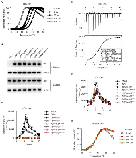 ITC was carried out according to a previous study with some modifications [40] using ITC200 (Malvern) at 25 °C with a constant stirring rate at 750 rpm. GltB was diluted in buffer (50 mM Tris-HCl, PH 7.5, 300 mM NaCl) and glucose was dissolved in the same buffer. The GltB protein solution (370 μL at 17 μM) was prepared, and then degassed and injected into the sample cell, followed by the titration of glucose solution (220 μL at 200 μM). The ligand was injected twenty times (1 μL for injection 1 and 2 μL for injections 2-20), with 120 s intervals between injections. Raw titration data were concentration-normalized and corrected for dilution effects prior to analysis using the “One-binding site model” of the MicroCal version of ORIGIN. The parameters ΔH (reaction enthalpy), KA (binding constant, KA = 1/KD) and n (reaction stoichiometry) were determined from the curve fit. The changes in free energy (ΔG) and entropy (ΔS) were calculated from the values of KA and ΔH with the equation: ΔG = −RT ln KA = ΔH − TΔS, where R is the universal molar gas constant and T is the absolute temperature.