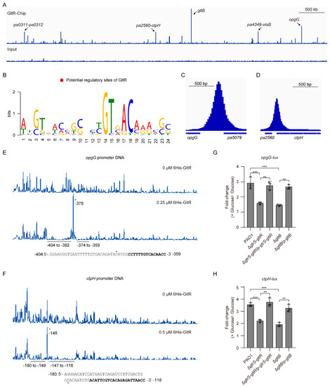 DNA fragments (200 to 500 bp) were selected for library construction, and sequencing libraries were prepared using the NEBNext Ultra II DNA Library Prep kit. The final DNA libraries were validated with Agilent 2100 Bioanalyzer using Agilent High Sensitivity DNA Kit, then the libraries were sequenced using the HiSeq PE150 system (Illumina) completed by Sangon Biotech (Shanghai, China). CHIP-seq reads were mapped to the P. aeruginosa genomes, using BBMap with two mismatches allowed. Only the uniquely mapped reads were kept for the subsequent analyses. The enriched peaks were identified using MACS14 software (version 1.4.2) [43] and were visualized and screenshots prepared using Integrative Genome Viewer (IGV) (Broad Institute, version 2.4.6). We filtered peaks called by MACS14 by requiring an adjusted score (i.e., −log10 p-value) of at least 50 in order to ensure that we had a high quality peak annotation, and peaks with a fold enrichment lower than 3-fold changes were also filtered out. A total of 16 peaks (≥10-fold enrichment, in average) were used to define the GltR-binding motif using the MEME tool [44]. Annotation of the peaks was performed using the SnpEff (4.3s) (http://www.htslib.org/, accessed on 1 May 2019). The CHIP-seq data files have been deposited in NCBI’s (National Center of Biotechnology Information) Gene Expression Omnibus (GEO) and can be accessed through GEO Series accession number GSE153848, with the following BioSample accession numbers: SAMN15457028 to SAMN15457031.