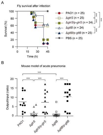 Drosophila infection was adapted from the fly needle pricking assay according to the protocol as previously described [49,50]. All P. aeruginosa strains were grown in PB medium at 37 °C overnight with shaking at 250 rpm, diluted 100-fold in fresh PB medium. Subsequently, the diluted cultures were grown in a 20-mL tube with a tube volume-to-medium ratio of 5:1 at 37 °C with shaking (250 rpm). After incubation for 3 h, bacteria were harvested by centrifugation, washed twice and suspended in PBS buffer (NaCl 8 g, KCl 0.2 g, Na2HPO4 1.44 g, KH2PO4 0.24 g, per liter) and then diluted the OD600 to 0.8. The dorsal side of the thorax of carbon dioxide-anesthetized male flies (~5 days old) was pricked with a sterilized tungsten needle dipped in the appropriate bacterial suspension or PBS buffer. The pricked flies were grown in the fly-food vial, kept at 25 °C and 65% humidity. Fly survival was counted and survival curves were processed with GraphPad Prism (GraphPad Software, Inc., San Diego, CA, USA) to perform a statistical log-rank (Mantel-Cox).