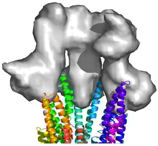 In addition to MxiK, the Spa33 pods also interact with MxiN (SctL), which forms radial “spokes” linking the pods with the Spa47 ATPase that forms a hub at the center of the sorting platform (Figure 2 and Figure 3) [,]. It has been shown that MxiN forms a homodimer using both two-hybrid analyses and analytical ultracentrifugation, thus suggesting that there are a total of 12 copies of MxiN within the sorting platform assembly [,]. The interaction of MxiN with the Spa33 heterotrimer can be demonstrated in vitro (unpublished data). Perhaps more importantly, MxiN’s interaction with Spa47 has been demonstrated in vitro and the dynamics of MxiN binding to different oligomeric states of the ATPase may have an important regulatory role in type III secretion []. No high-resolution structure has been solved for any member of the SctL (MxiN) family.