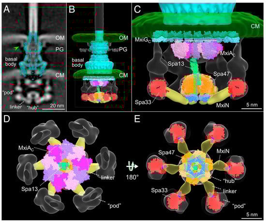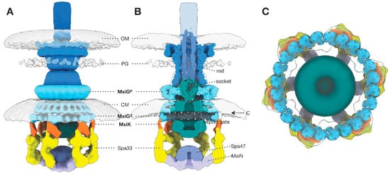 - Butan, C.; Lara-Tejero, M.; Li, W.; Liu, J.; Galan, J.E. High-resolution view of the type III secretion export apparatus in situ reveals membrane remodeling and a secretion pathway. Proc. Natl. Acad. Sci. USA 2019, 116, 24786–24795. [Google Scholar] [CrossRef]
