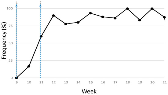 A total of 322 variants were identified among the 224 SARS-CoV-2 consensus sequences obtained in this study when compared to the reference strain (MN908947.3) [19], 250 (77.6%) of them appeared just once within the dataset. Each genome differed from the reference sequence in 2–13 nucleotide changes (1–9 amino acid changes), with an average of 7.1 SNPs per genome (between 3–4 amino acid changes). There were 17 mutations found in more than ten genomes, many of them are among the most frequently found globally [20,21], including a cluster of five mutations associated to clades 20A and 20B (lineage B and its sublineages): C241T (5’UTR, 78.1% of the samples), C3037T (nsp3 F924F, 79.5%), C14408T (nsp12 P4715L, 76.3%), A20268G (nsp15 L216L, 68.8%) and A23403G (Spike D614G, 79.5%). The D614G mutation in the Spike protein (A23403G) was detected in 16.7% of the samples from the first week (year-week 10), quickly increased in frequency up to 90% in the next two weeks and stayed over 80% until the end of the study period (Figure 1).