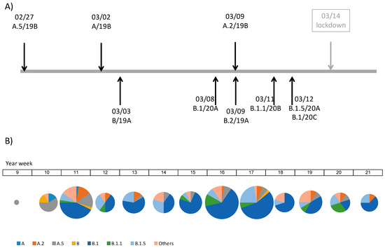 The sequences from our sample were spread throughout the whole SARS-CoV-2 genome tree (Figure S1), spanning most major lineages defined by the different schemes [15,18]. All the major clades and lineages identified were detected for the first time before the lockdown (March 14th) and no new ones were detected after this date (Figure 2A). The first sequences detected (weeks 9 and 10) belonged to the most basal groups (clade 19A/lineage B and clade 19B/lineage A). These basal clades originated in China, though they already had a global distribution. The earliest sample included in the dataset (from February 27th) belongs to lineage A.5, proposed by Gómez-Carballa et al. to have originated in Madrid (haplogroup B.9 in [10]). In week 11, sequences belonging to lineages A.2 (19B), as well as B.1, B.1.1 and B.1.5 (clades 20A, 20B and 20C) were detected for the first time. Lineages A.2 and A.5 have been proposed to be of Spanish origin, though they were not abundant in our sample. The most frequent lineages were B.1, associated to the Italian outbreak [21], and B.1.5, a European lineage with probable Spanish origin (https://cov-lineages.org/lineages.html (accessed on 3 February 2021)). In week 11, appeared a B.1 subgroup that carries the mutation G29734C and has been proposed to arise in Madrid (haplogroup A2a5c in ref. [10]). This subgroup makes almost one third of the B.1 sequences.