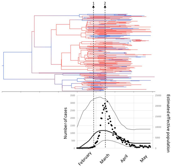 Phylodynamics of SARS-CoV-2 from Madrid. The tree shows the dated phylogeny. The tree is colored with a gradient from red (HPD = 0) to blue (HPD = 1). The plot below the tree is in the same time scale and shows the number of RT-PCR-confirmed cases in Madrid (black circles, left vertical axis) and the Bayesian skyline plot estimate of the effective population size (right vertical axis), the black line is the median estimate, and the grey lines indicate the 95% HPD interval. The arrows are (1) first case reported 25 February, (2) national lockdown, March 14th.