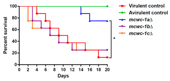 Male OF-1 mice weighing 30 g and two months old (Charles River, Barcelona, Spain) [30,32,33] were used as animal models for virulence assays. The mice were immunosuppressed by intraperitoneal administration of cyclophosphamide (200 mg/kg of body weight), 2 days prior to infection and then once every 5 days. Eight-mouse groups were challenged intravenously by retroorbital injection of 1 × 106 spores [32]. The assay was repeated twice using two independent mutants of mcwc-1a (MU242 and MU243). During this procedure, the mice were anesthetized using isoflurane via inhalation and monitored until they recovered from the anesthesia. Mice were housed under established conditions with free food and autoclaved water. The animal welfare was checked twice a day for 20 days, and those mice following the criteria for discomfort were euthanized by CO2 inhalation. Survival rates during the time were plotted in a Kaplan–Meier curve (Graph Pad Prism), and differences were considered statistically significant with a p-value ≤ 0.05 in a Mantel–Cox test.