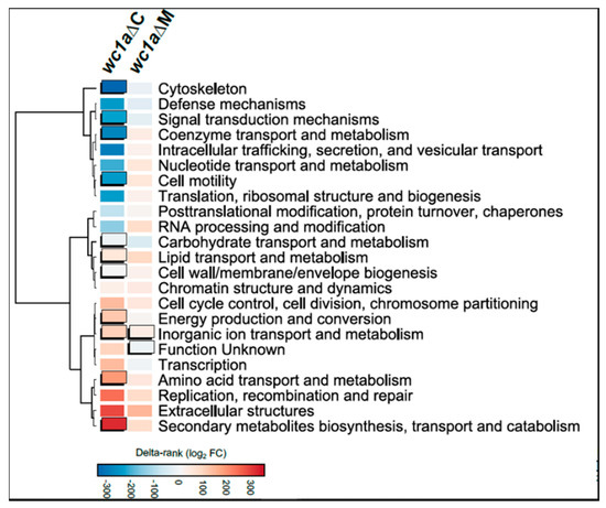 Significant genes during regular growth (wc1aΔc) and macrophage phagocytosis (wc1aΔM) were analyzed for Eukaryotic Orthologous Groups (KOG) class enrichment. Significant enrichments (Fisher’s exact test, p ≤ 0.05) are shown as uplifted rectangles. A measure of up- or down-regulation for each KOG class is indicated according to a colored scale of delta-rank values (the difference between the mean rank differential expression value of all genes in a particular KOG class and the mean rank differential expression value of all other genes). KOG classes are clustered according to the similarity of their delta rank values.