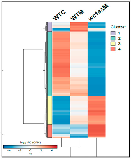 The expression values (calculated as the Z-score of CPM) of significant genes during macrophage phagocytosis are clustered by similarity to analyze phagocytosis response in the mcwc-1aΔ mutant. Expression values for wild-type strain in control conditions (WTC) and during macrophage phagocytosis (WTM), as well as for the mcwc-1aΔ during macrophage phagocytosis (wc1aΔM), are shown. Four major clusters were identified and shown as colored blocks that indicate the full length of the clusters.