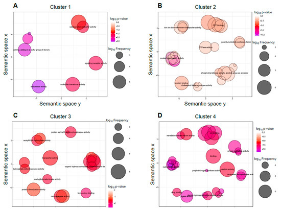 Gene Ontology molecular function terms enrichment in the mcwc-1a-dependent response to macrophage phagocytosis. (A–D) Each dot in the scatter plots represents a molecular function GO term, color-coded to indicate the p-value of the enrichment and size-coded to show the frequency of the term in the whole gene set, both in log10 units. The plots show GO terms remaining after redundancy reduction. The axes display a bidimensional space that shows semantic similarity among GO terms, i.e., GO terms close together are involved in similar GO molecular functions. Each plot shows GO molecular function enrichment in the genes comprised in clusters 1 (A), 2 (B), 3 (C), and 4 (D).