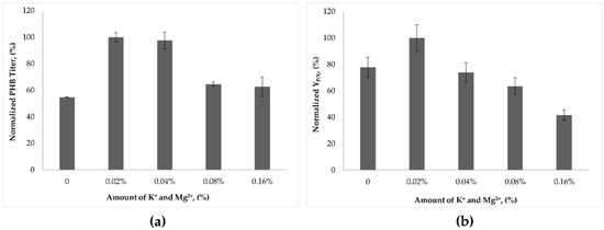 Effect of K+ and Mg2+ ions on PHB synthesis. (a) Normalized amount of PHB titer (%). (b) Normalized YP/X (%).