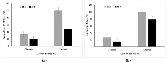 In the presence of 1% glucose and lactose at pH 8.8 (±0.2) and 30 °C, the amounts of both PHB and YP/X obtained for glucose were lower than for lactose. For 24 h of cultivation, the amount of PHB obtained with glucose was almost 65% lower than that obtained with lactose. A prolonged cultivation time (48 h) caused a moderate decrease in the amount of PHB obtained in the presence of glucose; however, in the presence of lactose, the amount of PHB was halved (Figure 2a). As for the yield of PHB (YP/X), it was almost 75% lower for glucose compared to lactose (Figure 2b). A prolonged cultivation time (48 h) caused a dramatic decrease in the PHB yield for glucose, but for lactose, the decrease of PHB yield was almost 20% (Figure 2b).