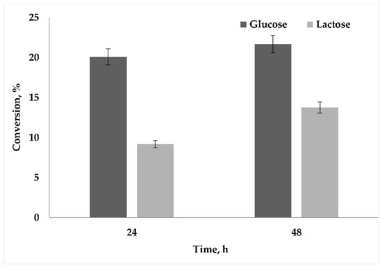 Comparing the glucose and lactose consumption, during the first 24 h (Figure 3), 20% and 10% of the initial glucose and lactose concentrations, respectively, were consumed. However, during the prolonged cultivation period (48 h), a slight increase was observed for glucose consumption (21% of the initial glucose concentration). As for lactose, the conversion was increased from 9.16% to 13.75%. According to these results, we assumed that lactose rather than glucose induces the production of PHB in B. marmarensis.