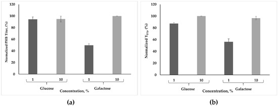 Effect of galactose on PHB synthesis. (a) Normalized amount of PHB titer (%). (b) Normalized YP/X (%).