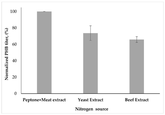 The removal of peptone and the use of yeast extract as the nitrogen source caused a decrease in both the PHB titer and YP/X in the three carbon sources evaluated. The presence of yeast extract reduced the PHB titer from 140 ± 32.20 mg/L to 20 ± 4.860 mg/L in lactose, from 60 ± 16.60 mg/L to 35 ± 6.650 mg/L in glucose, and from 30 ± 4.210 mg/L to 10 ± 2.160 mg/L in olive oil, while YP/X values were decreased from 125 ± 25.40 mg PHB/g dry cell mass to 30.30 ± 3.636 mg PHB/g dry cell mass in lactose and from 25 ± 3.762 mg PHB/g dry cell mass to 12.50 ± 2.625 mg PHB/g dry cell mass in olive oil. For glucose, the yield of PHB obtained from the yeast extract was very close to the YP/X obtained in the presence of meat extract and peptone. The lowest PHB titer (10 ± 2.160 mg/L) and YP/X (12.50 ± 2.625 mg PHB/g dry cell mass) were obtained in olive oil in the presence of yeast extract as the nitrogen source.
