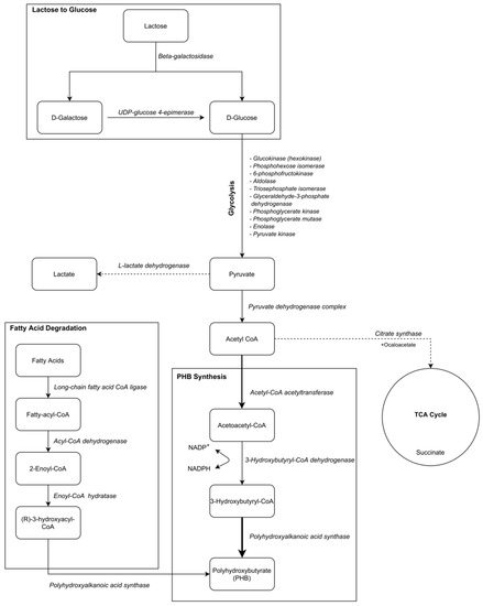 The production of PHB is achieved through the NADPH-dependent pathway by converting acetyl-CoA to PHB [30]. Since succinate and lactate are produced during cultivation [16], B. marmarensis prefers either the citric acid cycle (the TCA cycle) or PHB synthesis. This situation could be an indicator of a competition between these two alternative routes in the metabolic pathway. In the presence of lactose, the enzyme responsible for PHB formation could be induced, and B. marmarensis prefers to produce more PHB from lactose.