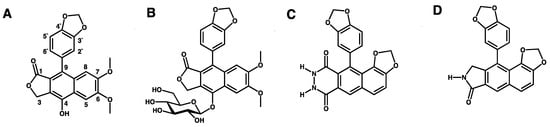Structures of the studied compounds. (A) Diphyllin, (B) cleistanthin B, (C) helioxanthin 8-1, and (D) helioxanthin 5-4-2.