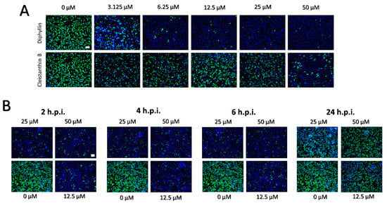 (A) Inhibition of SARS-CoV-2 viral antigen expression by diphyllin and cleistanthin B. Compound-treated and virus-infected Vero cells cultivated for 48 h.p.i. were fixed on slides, then stained with a SARS-CoV-2 specific antibody labeled with FITC (green), and counterstained with DAPI (blue). (B) Immunofluorescence staining of Vero cell cultures infected with SARS-CoV-2 and treated with diphyllin at 2, 4, 6, and 24 h.p.i. The immunofluorescent staining procedure was identical as in (A). Scale bars; 50 µM.