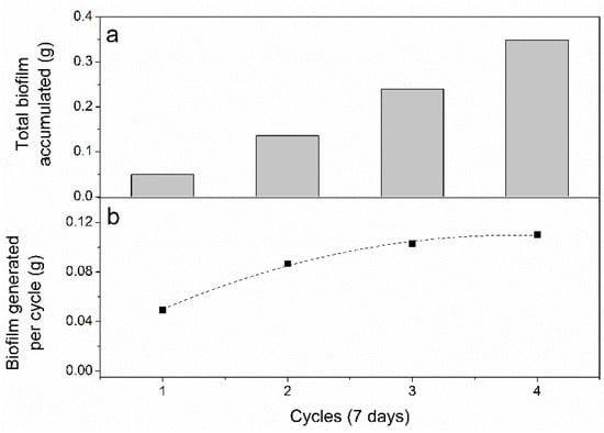 Evidence of active microbial growth over the cathode surface during the bioelectrochemical experiments, as indicated by (a) accumulated biomass at the end of each seven-day cycle, and (b) biomass generated in each cycle.