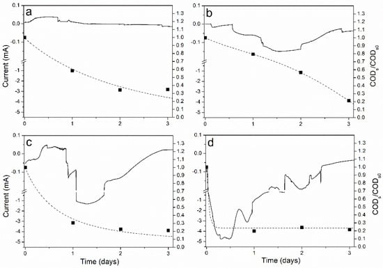 Cronoammperograms (black continuous line) and time course of normalized soluble chemical oxygen demand (COD) (black dash line) at different voltages: −0.2 V (a), −0.4 V (b), −0.6 V (c) and −0.8 V (d).