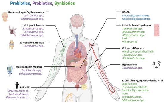 Multiple autoimmune and inflammatory disorders have been linked to gut microbial dysbiosis, including SLE, MS, and RA, for which the therapeutic use of probiotics and prebiotics could potentially be beneficial. Probiotic treatment of RA with multiple species of Lactobacillus and treatment of SLE with Bifidobacterium and Lactobacillus were both found to be efficacious in reducing inflammatory mediators and symptoms in their respective disease states [79,80]. MS treatment with probiotic supplementation of Lactobacillus resulted in a microbial shift, decreasing populations of MS-associated Anaeroplasma, Rikenellaceae, and Clostridium [81]. Probiotic supplementation with multiple Lactobacillus, Streptococcus, and Bifidobacterium species resulted in an increased abundance of Lactobacillus and Bifidobacterium in the gut and produced an anti-inflammatory peripheral immune response in patients with MS [82].