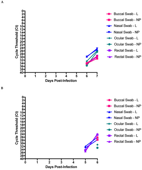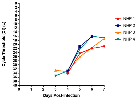 The NHPs followed a well characterized course of disease, where viral RNA was detected between 3 and 4DPI and steadily increased until multi-organ system failure and death, at which time viral RNA was at its peak [25,26,27]. Interestingly, the amount of virus at end-point in the second animal was higher than in the first study, despite the initial infection TCID50 being less in the second animal (based on back titer). This suggests individual and unique courses of infection and progression of disease, as opposed end-point viremia being proportional or related to infectious dose. Ct ranges in our studies were comparable to clinical courses seen in humans [4,5,28,29].