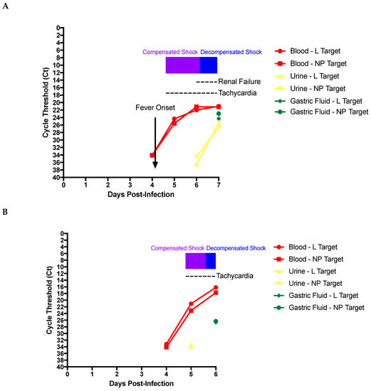 - Spengler, J.R.; McElroy, A.K.; Harmon, J.R.; Ströher, U.; Nichol, S.T.; Spiropoulou, C.F. Relationship Between Ebola Virus Real-Time Quantitative Polymerase Chain Reaction–Based Threshold Cycle Value and Virus Isolation from Human Plasma. J. Infect. Dis. 2015, 212, S346–S349. [Google Scholar] [CrossRef] [PubMed][Green Version]