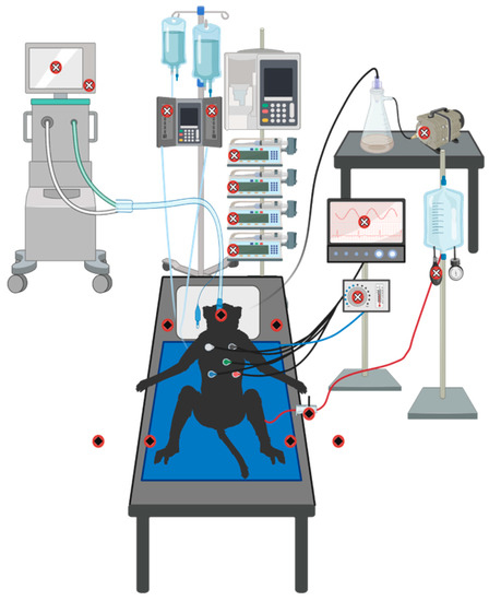 ) included the Avea Ventilator dial and entirety of screen, the Intellivue MX800 Patient Monitor screen, the Alaris SE Volumetric Pump, four Alaris CC Syringe Pumps, the pressure bulbs to maintain adequate pressure for ART-lines, the suction pump, and the HotDog Veterinary Patient Warming System on/off button (not shown).