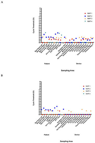 Viral nucleic acid was found on medical equipment and in the treatment environment during the recent West African Ebola epidemic [19,24]. Therefore, we sought to investigate which areas in our ICU had the highest viral burden. Areas were categorized as “patient” or “device” areas (Figure 4). Multiple surface areas had detectable viral nucleic acid in the immediate patient area (Figure 5A,B). Specifically, the head of the bed, the ETT, and the CVP and ART-line transducers. While many surfaces in the device area had no detectable virus, multiple surfaces were positive by PCR, such as the buttons on the IV and temperature pumps (Figure 5A,B). Between all four animals the lowest Ct on any surface was 27.7, and all surfaces in the device area had high Ct values, greater than 33.