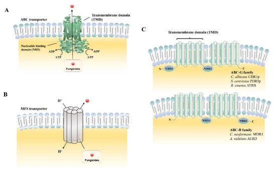 The ABC superfamily is the dominant drug transporter, consisting of a transmembrane domain (TMDs) and a structurally conserved nucleotide-binding domain (NBDs) (Figure 1A,C). One important property of ABC transporters is their low substrate specificity, which allows them to transport a variety of structurally different compounds [20]. Based on the “architectures” of the protein, the ABC transporters were grouped into seven sub families (A–G). Unlike ABC transporters that export toxic compounds by tight coupling of ATP cleavage, the MFS transporters transfer compounds by the proton-motive force across the fungal plasma membrane (Figure 1B). In total, the MFS transporters contain 74 families, with each usually responsible for a specific substrate type [21]. Table 1 lists the ABC and MFS transporters currently identified in phytopathogenic fungi. The known functions of MFS transporters include drug efflux systems, transfer endogenously produced toxins, metabolites of the Krebs cycle, organophosphate/phosphate exchangers, and bacterial aromatic permeases [19].
