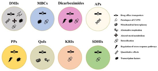 Non-target site mechanisms of resistance to major classes of fungicides used for crop disease management. Each circle with different colors represents a chemical class, whereas symbols within circles each represent a resistance mechanism as shown in the figure. DMIs: Demethylation inhibitors; MBCs: Methyl benzimidazole carbamates; APs: Anilino-pyrimidines; PPs: Phenylpyrroles; QoIs: Quinone outside inhibitors; KRIs: Ketoreductase inhibitors; SDHIs: Succinate dehydrogenase inhibitors.