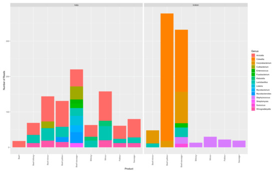Number of reads (n ≥ 10) assigned to different genera obtained from various product types.