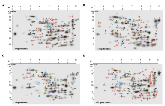 Proteomic profile of the whole extract of extracellular tachyzoites at 30 min of treatment. (A) Control without treatment; (B) DHEA 10 μM; (C) S-P 800 μM, and (D) DHEA 10 μM/S-P 800 μM. The red crosses represent the spots located in each treatment, numbers in the spots represent the proteins analyzed (listed in Table 1), and the blue circles represent the missing proteins in each condition.