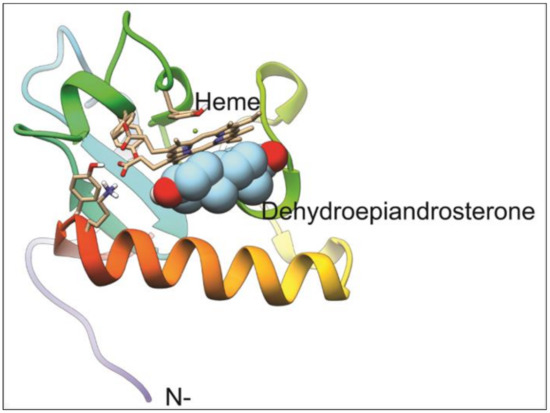 Model for T. gondii progesterone receptor membrane component (PGRMC) homolog and its docking to DHEA. The model for PGRMC contains a binding pocket for a heme group that functions as the binding site for DHEA. TYR158 binds the heme group on one face, while the other binds DHEA, blocking any interaction at that site.
