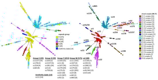 - Mulhall, R.M.; Bennett, D.E.; Bratcher, H.B.; Jolley, K.A.; Bray, J.E.; O’Lorcain, P.P.; Cotter, S.M.; Maiden, M.C.J.; Cunney, R.J. cgMLST characterisation of invasive Neisseria meningitidis serogroup C and W strains associated with increasing disease incidence in the Republic of Ireland. PLoS ONE 2019, 14, e0216771. [Google Scholar] [CrossRef] [PubMed]