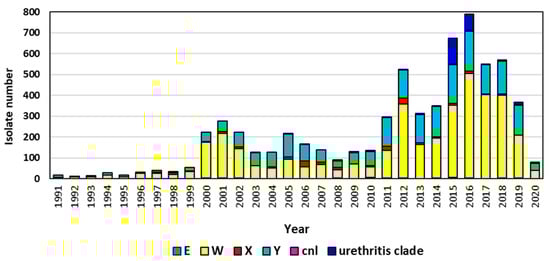 - Tzeng, Y.L.; Bazan, J.A.; Turner, A.N.; Wang, X.; Retchless, A.C.; Read, T.D.; Toh, E.; Nelson, D.E.; Del Rio, C.; Stephens, D.S. Emergence of a new Neisseria meningitidis clonal complex 11 lineage 11.2 clade as an effective urogenital pathogen. Proc. Natl. Acad. Sci. USA 2017, 114, 4237–4242. [Google Scholar] [CrossRef] [PubMed]